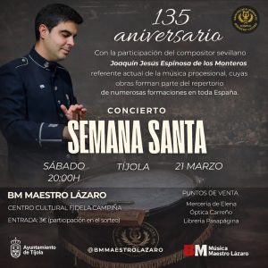 El concierto se celebrará el sábado 21 de marzo a las 20:00 horas en el Centro Cultural Fidela Campiña y contará con la colaboración especial del compositor sevillano Joaquín Jesús Espinosa de los Monteros, una de las referencias actuales de la música procesional, cuyas composiciones forman parte del repertorio de numerosas formaciones musicales en toda España.