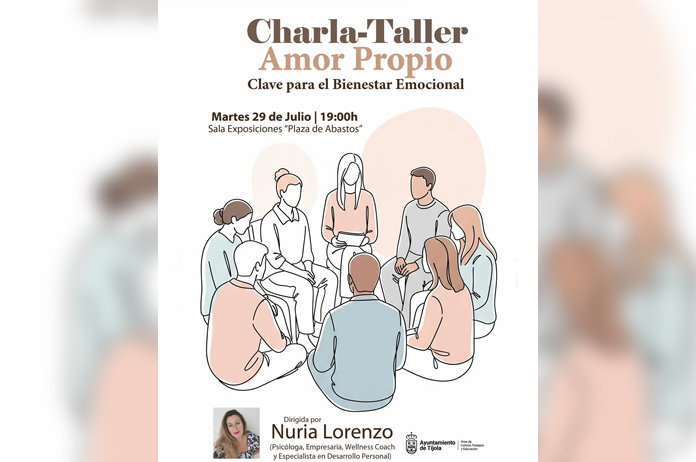 El próximo martes 29 de julio, la Sala de Exposiciones “Plaza de Abastos” de Tíjola acogerá a las 19:00 horas una charla-taller gratuita bajo el título “Amor propio: clave para el bienestar emocional”, una sesión práctica dirigida a todas aquellas personas interesadas en mejorar su salud emocional y reconectar consigo mismas.